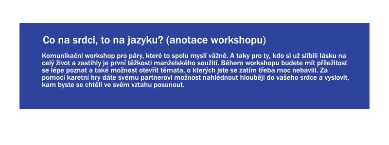 S manželem jsme byli pozvání v loňském i letošním roce do Centra pro rodinu v Hodoníně. Připravili jsme si workshop pro páry. A protože se setkal s velmi pozitivními ohlasy, rozhodli jsme se ho nabídnout i vám. Pokud plánujete uspořádat smysluplnou akci pro páry ve vašem okolí, můžete na na nás obrátit. Pokud to bude jen trochu možné, rádi dorazíme i do vaší obce.